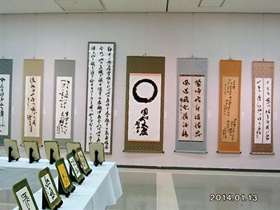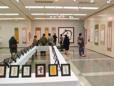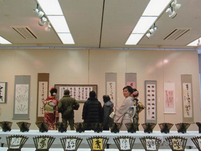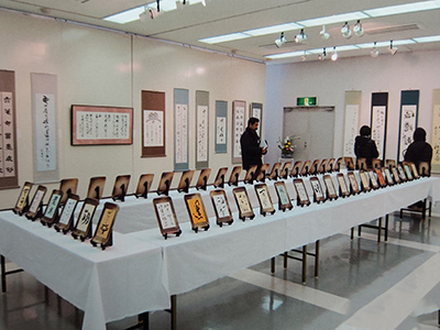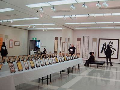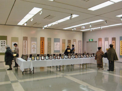 大作品から小作品まで、額装・軸装など、自由な内容・形式の作品と出品者同規格のミニ作品の一人2点で陳列されている 青森・岩手・北海道の仲間による新春展です。